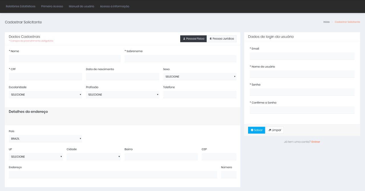 de usuário e senha de acesso, os campos com * são obrigatórios;